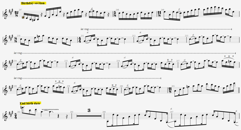 As you can see, I, matter of factly, wrote out these exact numbers as time signatures and basically spelled out each of the numbers of the birth date using 8th notes. December is covered in the first 12/8 measure, 5th is covered in the 5/8 measure, 19 is split between bars 249-50, a measure of 11/8 and 8/8, and then the 91 remaining beats are accounted for in the next 10 bars of 4/4 (80 8th notes) and the final bar of 11/8, adding up to 91 8th note beats altogether. Pretty cool right? Or is it too nerdy? I’ll let you decide.